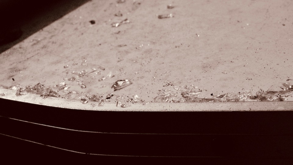 Tampaknya kaca jendela kereta yang saya tumpangi tertimpuk benda keras dari arah luar. Seseorang mungkin melempar batu ke arah kereta dan mengenai jendela, tindakan yang sungguh barbar, tak berpendidikan, dan nirtanggung jawab. Kaca jendela yang pecah sudah diganti dengan yang baru, sayang belingnya belum dibuang.