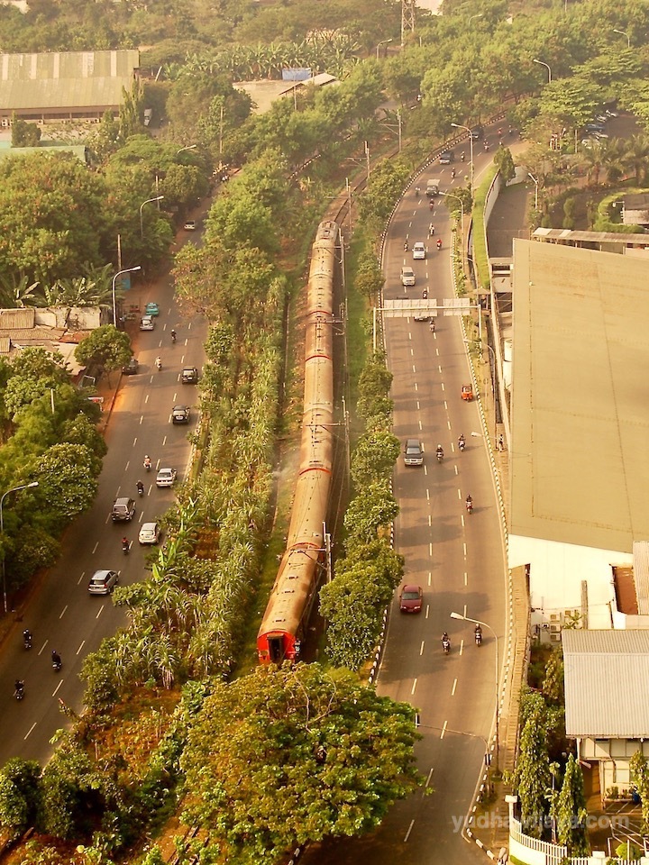 Rangkaian kereta api kelas ekonomi di sinyal masuk Stasiun Palmerah. Foto serupa di railpictures.net. Bedanya rangkaian ini ditarik dua lokomotif BB301/4.