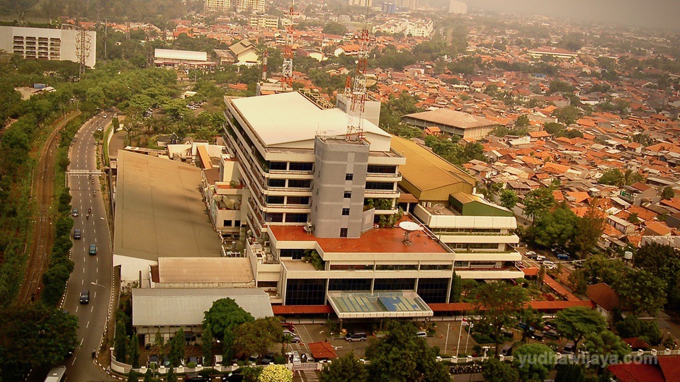 Gedung Kompas Gramedia di Palmerah. Di sebelah kiri adalah jalur rel tunggal petak Palmerah-Kebayoran.